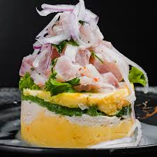 Creamy citrus-infused mashed potatoes layered with chicken, topped with fresh fish ceviche and its vibrant, tangy marinade